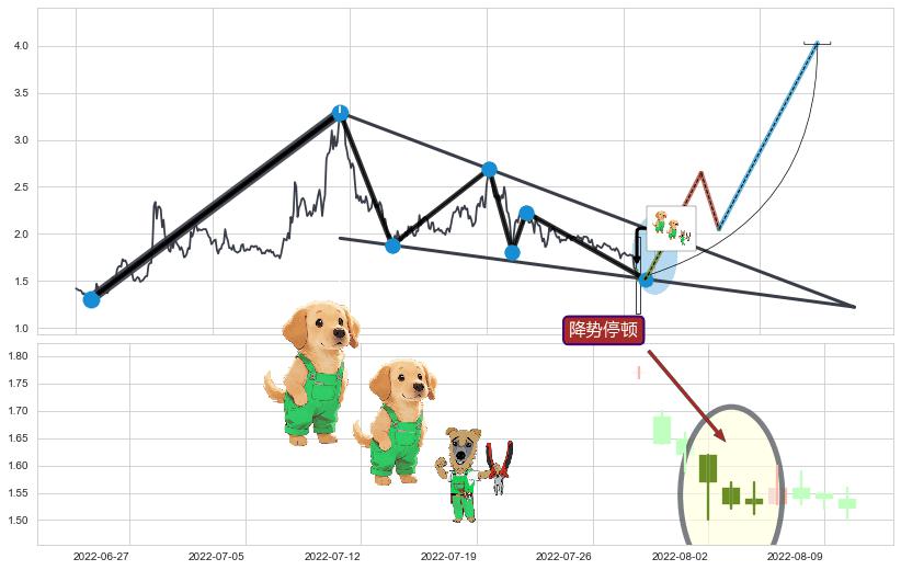 | 2 🅚:【高山滑雪】买入点 ➕ 📐:降楔型猜想突破点临近,临近关键阻力位,预期拉升突破上涨 ☞ 看多信号 ⇥ 【均线】交织【图形】⇥ 综合量化分数: 52 | > |