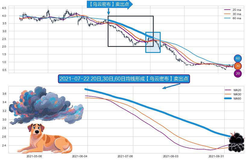 ⚀ 2021-06-03日-2021-09-06日显现 20日-30日-60日均线 【乌云密布】卖出点 看空信号,后市看跌,卖出