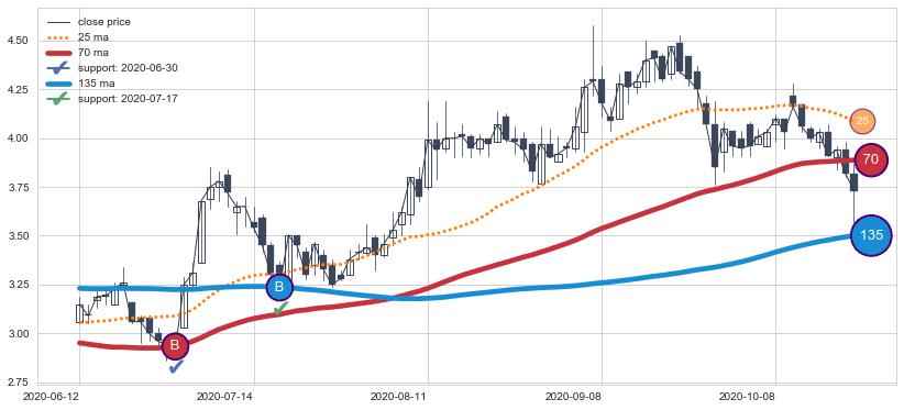 ⚅ 卖点向下突破均线后,价格持续向下走低,向下动能充足,均线斥力助跌效果明显