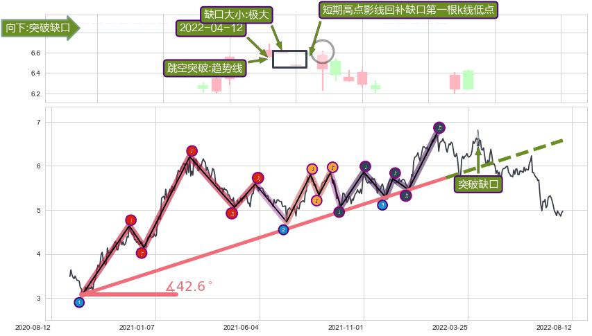 ➣ 2020-09-23-2022-02-24上升趋势存在反转[风险],其原上升趋势的支撑位(6.58)已破位[强阻力信号],原上升趋势角度: 42.6˚