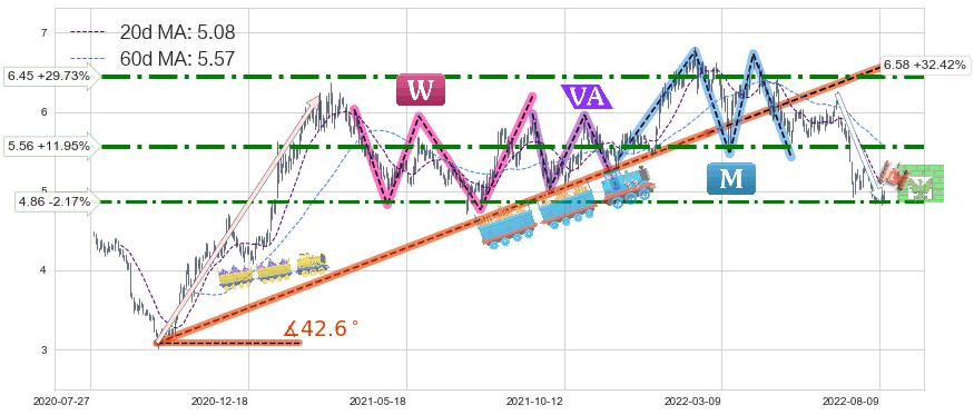 ♘ 阻力价格位4.86,可信任强度66.53%,距离最后交易2022-08-12形成的收盘价格4.97相差 -2.17%