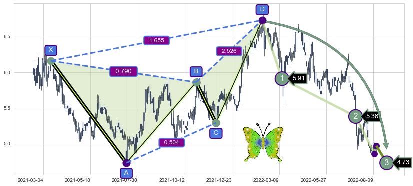 ➣ 已完成【蝴蝶】形态起点X: 2021-03-16, 终点D: 2022-02-11, 共225交易日