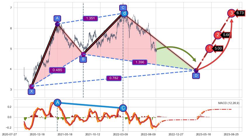 ➢ 谐波价格A点比C点低 ⤵,【MACD】指标A点比C点高 ⤴️