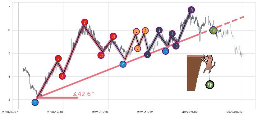 ✂️ 2020-09-23-2022-02-24上升趋势存在反转[风险],其原上升趋势的支撑位(6.58)已破位[强阻力信号],原上升趋势角度: 42.6˚