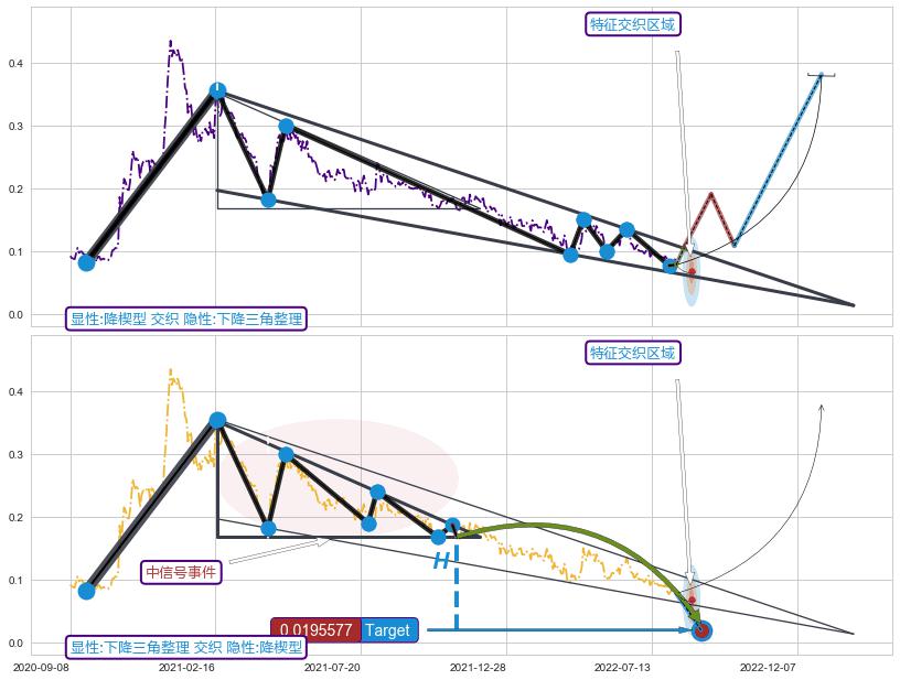 ➢ 【多方力量耗尽,空方打破攻守平衡点】下降三角形中继整理, 已在2021-11-01突破【支撑】颈线 0.168000 →演变成下降通道