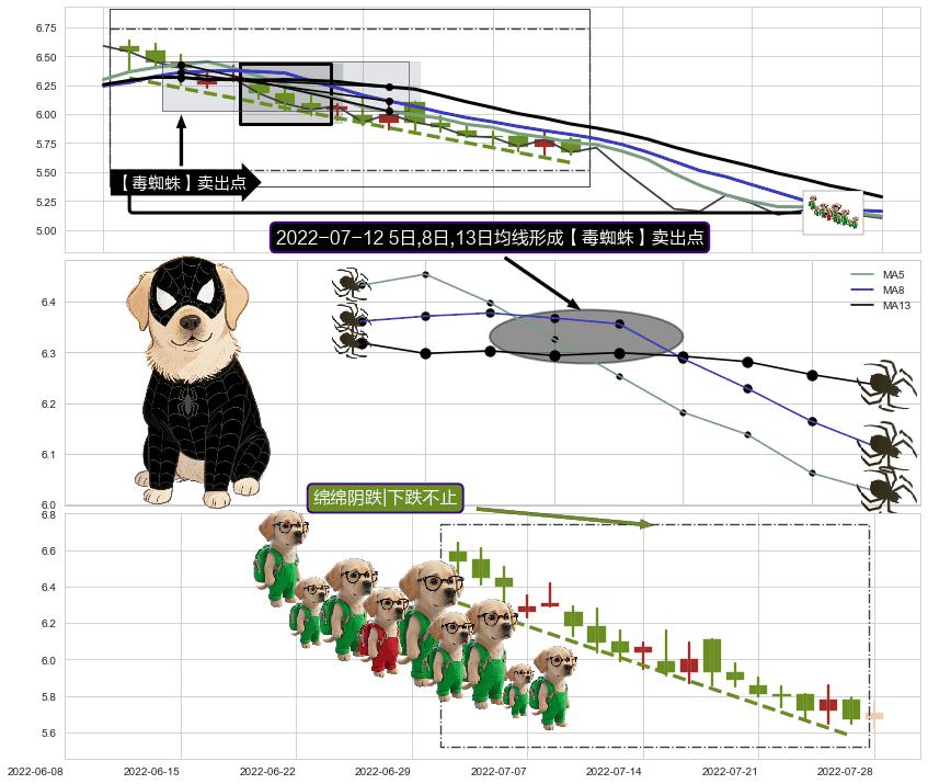 | 3 🅚:【毒蜘蛛】卖出点 ➕ 📐:下降对称三角整理下行突破支撑位破位, 猜想持续下沉下跌,被突破的支撑位已变为阻力位 ☞ 看空信号 ⇥ 【均线】交织【图形】⇥ 综合量化分数: 38 | > |