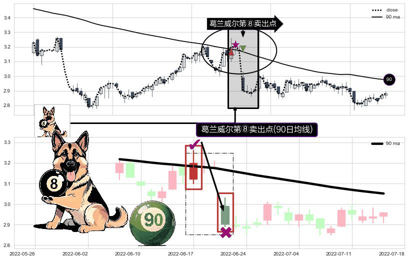⚀ 2022-06-22-日显现 葛兰威尔均线 90日均线 第⑧卖出点 下降趋势的中继信号,后市看跌,卖出信号