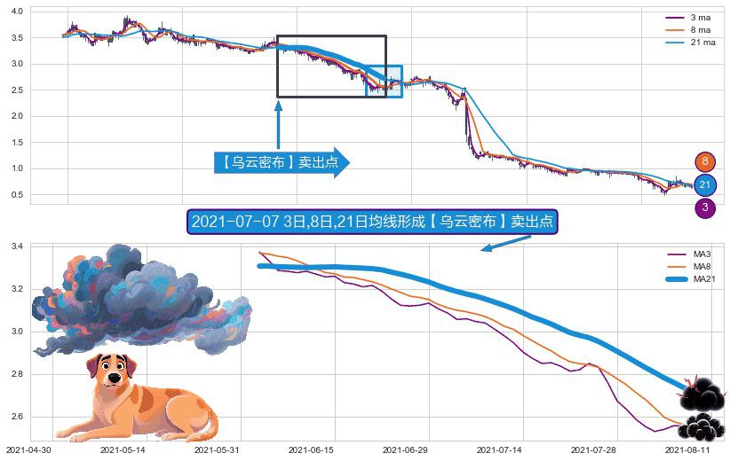 形态多维评估: ⚀ 2021-06-02日-2021-08-09日显现 3日-8日-21日均线 【乌云密布】卖出点 看空信号,后市看跌,卖出