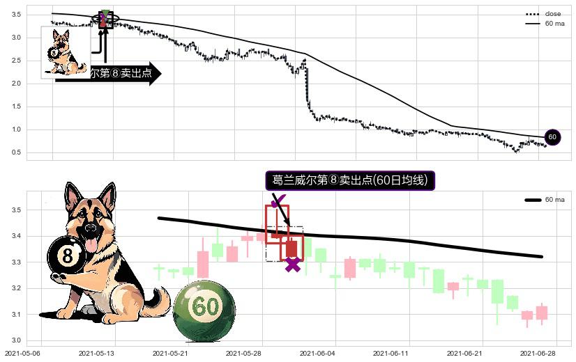 形态多维评估: ⚀ 2021-06-01-日显现 葛兰威尔均线 60日均线 第⑧卖出点 下降趋势的中继信号,后市看跌,卖出信号