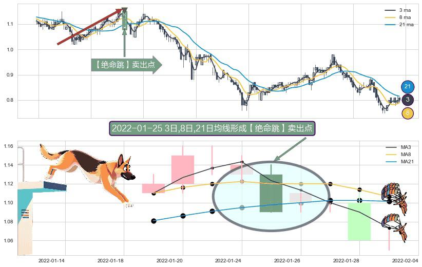 形态多维评估: ⚀ 2022-01-25日显现 3日-8日-21日均线 【绝命跳】卖出点 看空信号,后市看跌,卖出