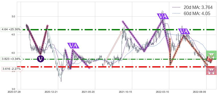 ♘ 阻力价格位3.823,可信任强度66.18%,距离最后交易2022-08-12形成的收盘价格3.700相差 +3.34%