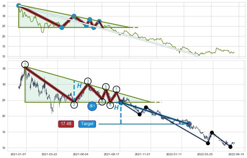 ➣ 最小中继整理跌幅→𝐇: 6.87 (下侧直角边第一支撑点②与斜边垂直距离)