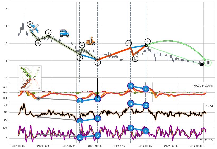 ➣ 1,3,5驱动浪MACD, RSI, KDJ走势都出现【常规背离】反转信号增强