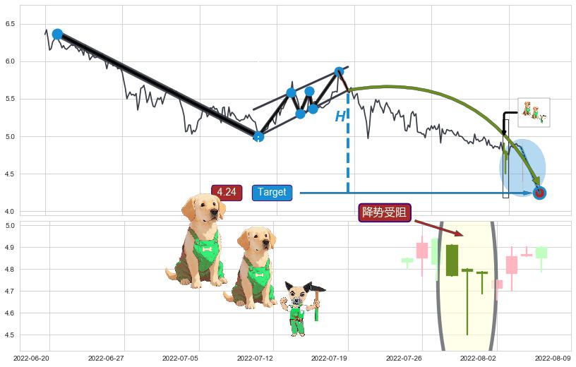 ➣ D点拟合预测价格6.56,距离最后交易收盘价格4.85相差 +35.30%