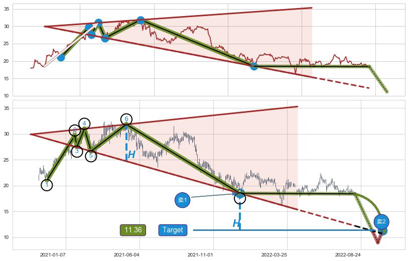 ➢ 最小反转跌幅→𝐇: 7.14 (逐步抬高阻力斜边最后的阻力点⑥与支撑边垂直距离)