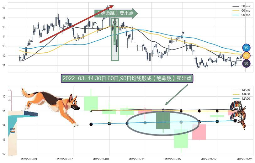 形态多维评估: ⚀ 2022-03-14日显现 30日-60日-90日均线 【绝命跳】卖出点 看空信号,后市看跌,卖出