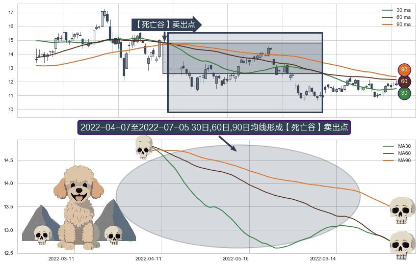 形态多维评估: ⚀ 2022-04-08-日至2022-07-05-日显现 30日-60日-90日均线 【死亡谷】卖出点 看空信号,后市看跌,卖出