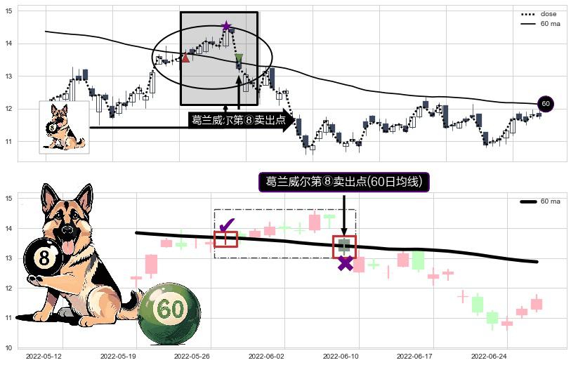 形态多维评估: ⚀ 2022-06-09-日显现 葛兰威尔均线 60日均线 第⑧卖出点 下降趋势的中继信号,后市看跌,卖出信号