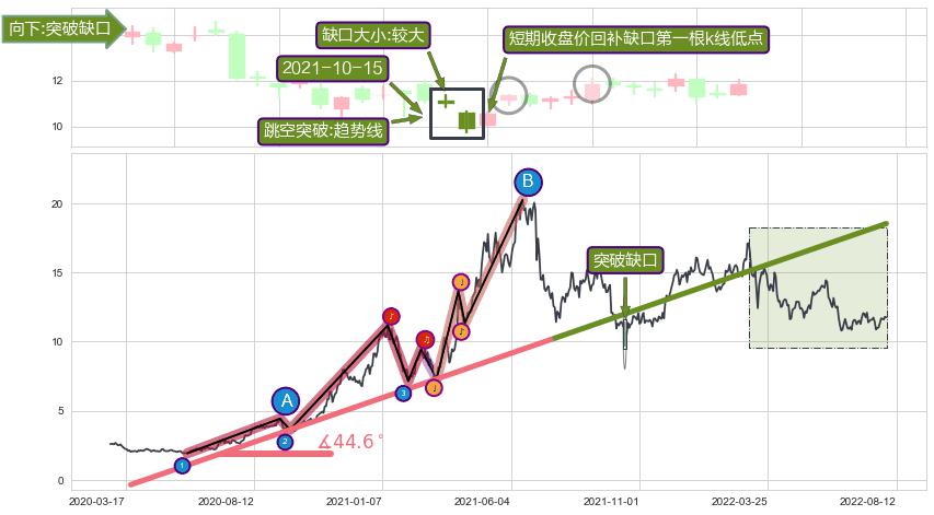 ➢ 突破缺口形成后,后续k已经超过14根,跳空突破趋势线关键点后, 出现【完全回踩】迹象,短期收盘价回补缺口第一根k线低点