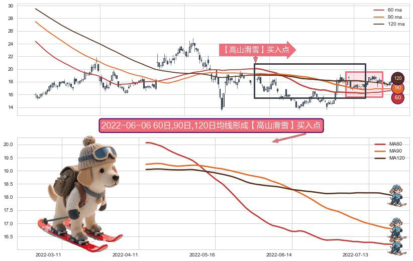 ⚀ 2022-04-13日-2022-07-21日显现 60日-90日-120日均线 【高山滑雪】买入点 看多信号,后市看涨,买入