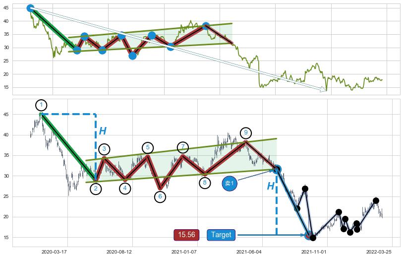 ➣ 最小中继整理跌幅→𝐇: 16.05 (𝐇旗杆的长度:旗杆起点→顶点)
