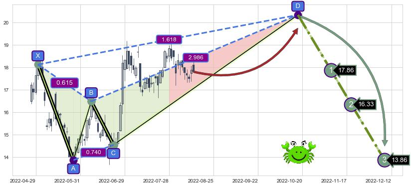 ➣ 未完成【螃蟹】形态起点X: 2022-05-03, 已到达C点: 2022-06-22, 预测最终D点: 2022-10-18, 共107交易日