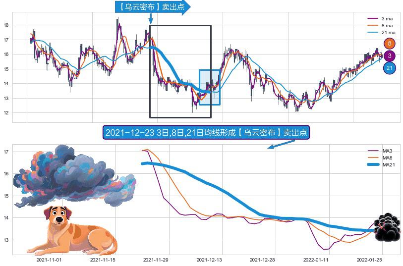 形态多维评估: ⚀ 2021-11-22日-2022-01-25日显现 3日-8日-21日均线 【乌云密布】卖出点 看空信号,后市看跌,卖出