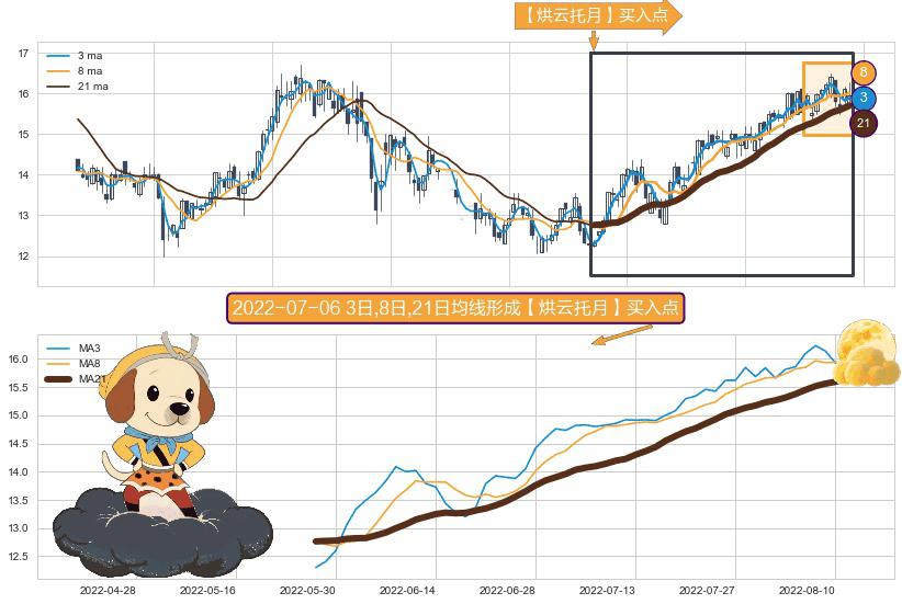 形态多维评估: ⚀ 2022-05-26日-2022-08-12日显现 3日-8日-21日均线 【烘云托月】买入点 看多信号,后市看涨,买入