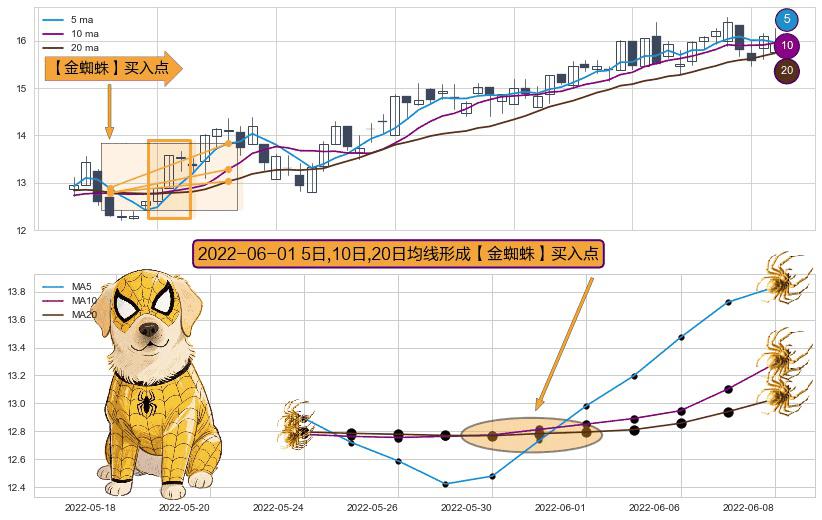 形态多维评估: ⚀ 2022-06-01日显现 5日-10日-20日均线 【金蜘蛛】买入点 看多信号,后市看涨,买入