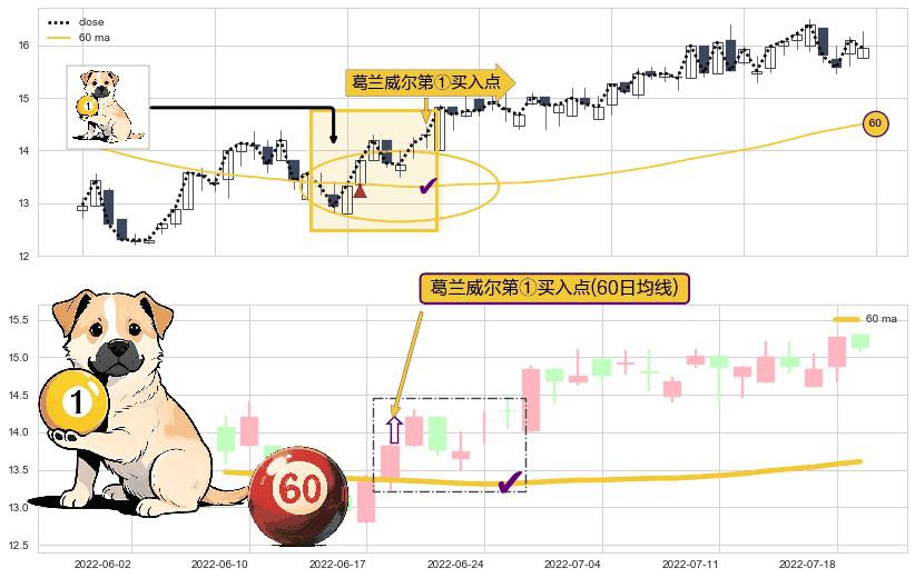 形态多维评估: ⚀ 2022-06-20-日显现 葛兰威尔均线 60日均线 第买①入点 走势反转见底信号,后市看涨,买进信号
