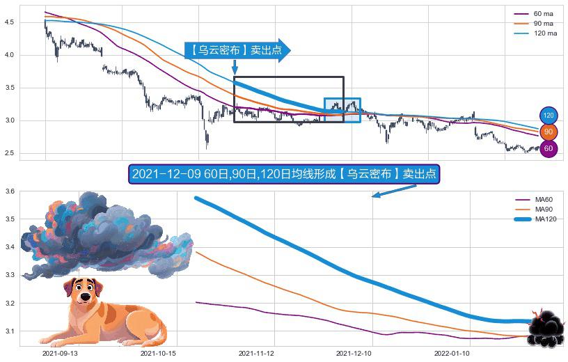 ⚀ 2021-10-21日-2022-01-28日显现 60日-90日-120日均线 【乌云密布】卖出点 看空信号,后市看跌,卖出