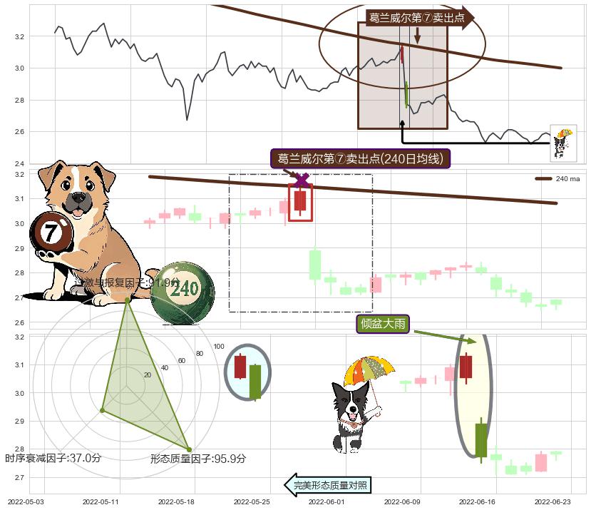 | 2 🅚:下跌两颗星 | 下跌三颗星 ➕ 🎢:葛兰威尔第⑦卖出点卖出点信号形成后,猜想后续反弹结束,持续回落下跌(趋势跟踪) ☞ 看空信号 ⇥ 【均线】交织【🅚线】⇥ 综合量化分数: 35 | > |