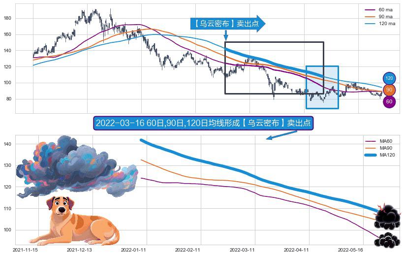 ⚀ 2022-01-07日-2022-05-25日显现 60日-90日-120日均线 【乌云密布】卖出点 看空信号,后市看跌,卖出