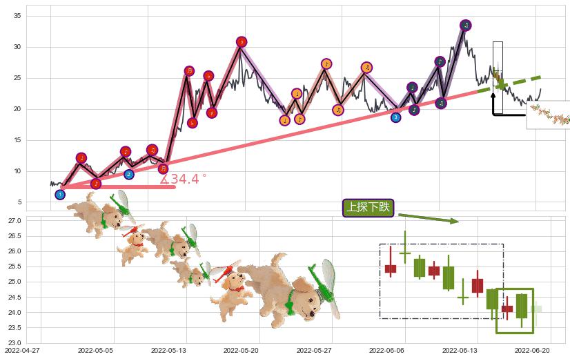 ➣ 2020-08-12-2022-05-11上升趋势存在反转[风险],虽然原上升趋势的支撑位(25.13)已破位,但其支撑效果尚存,原上升趋势角度: 34.4˚