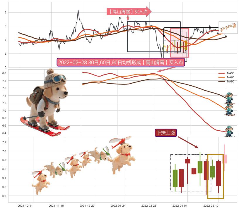 | 4 🅚:两红夹一黑 ➕ 🎢:【高山滑雪】买入点均线组合买入点信号形成后,猜想后续下行结束,持续反弹上涨(均值回复) ☞ 看多信号 ⇥ 【均线】交织【🅚线】⇥ 综合量化分数: 56 | > |
