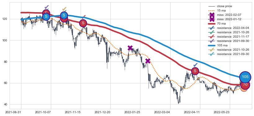 ⚄ 价格在均线遇到阻力后已再次向下回落了【较长】距离, 第⑦卖出点 阻力效果得到【初步确认】