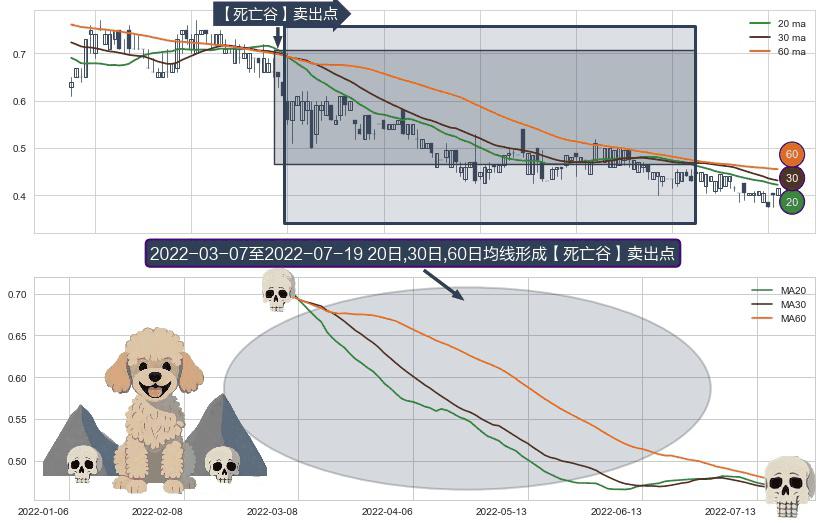 ⚀ 2022-03-08-日至2022-07-19-日显现 20日-30日-60日均线 【死亡谷】卖出点 看空信号,后市看跌,卖出