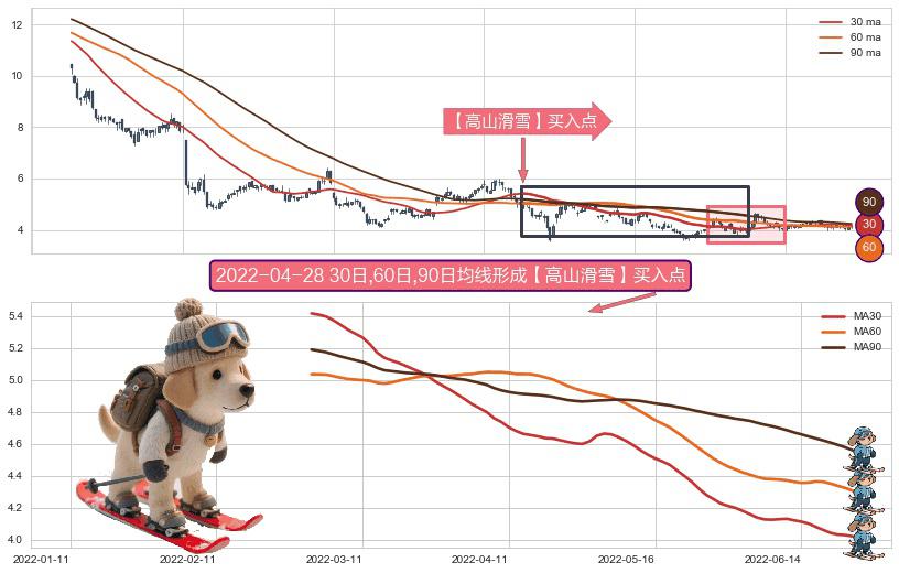形态多维评估: ⚀ 2022-03-02日-2022-06-23日显现 30日-60日-90日均线 【高山滑雪】买入点 看多信号,后市看涨,买入