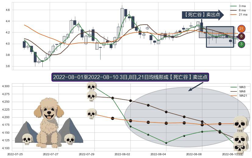 形态多维评估: ⚀ 2022-08-02-日至2022-08-10-日显现 3日-8日-21日均线 【死亡谷】卖出点 看空信号,后市看跌,卖出