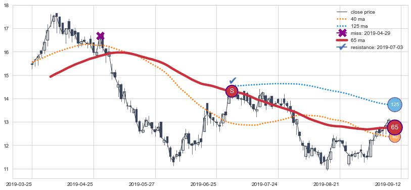 下跌趋势2019-03-25-2019-09-12,均线65确认关键阻力1处