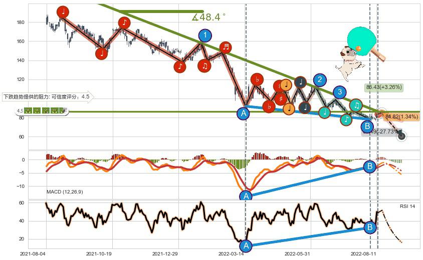 ♘ 在最后的下跌阶段2021-08-19至2022-08-12,存在 持续未破位的阻力位 ,阻力价格86.43,可信任强度87.60%,其距离最后价格83.70相差 +3.26%