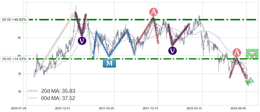 ♘ 阻力价格位39.05,可信任强度79.45%,距离最后交易2022-08-12形成的收盘价格34.10相差 +14.53%