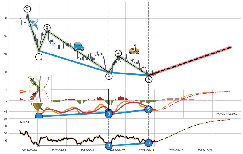 ➣ 第一, 三, 五浪下跌动能逐渐【衰弱变小】,趋势呈现不稳迹象