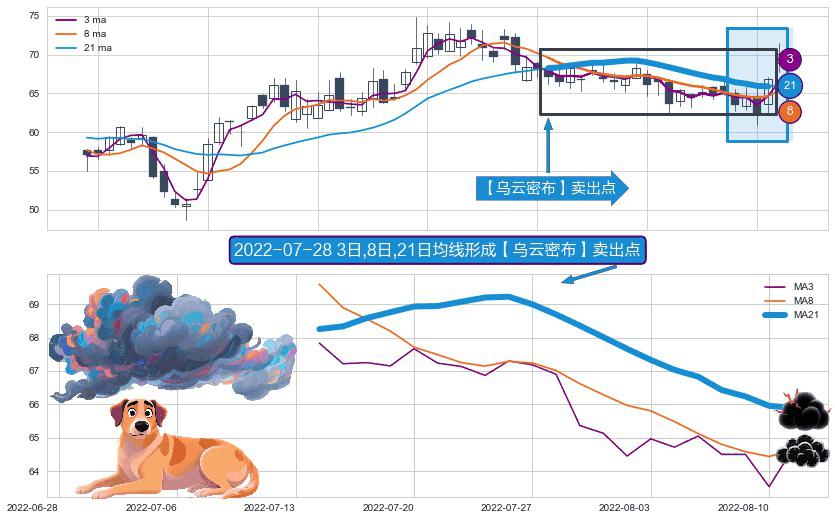 ⚀ 2022-07-14日-2022-08-11日显现 3日-8日-21日均线 【乌云密布】卖出点 看空信号,后市看跌,卖出