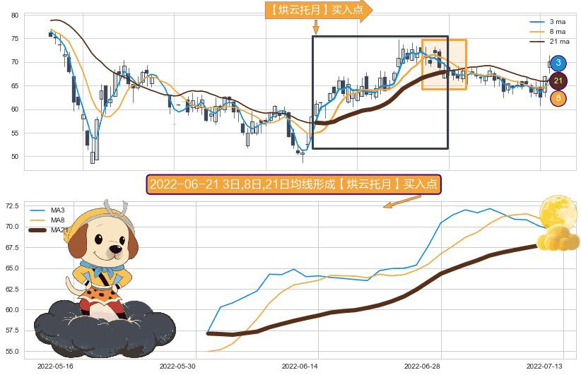⚀ 2022-05-31日-2022-07-12日显现 3日-8日-21日均线 【烘云托月】买入点 看多信号,后市看涨,买入