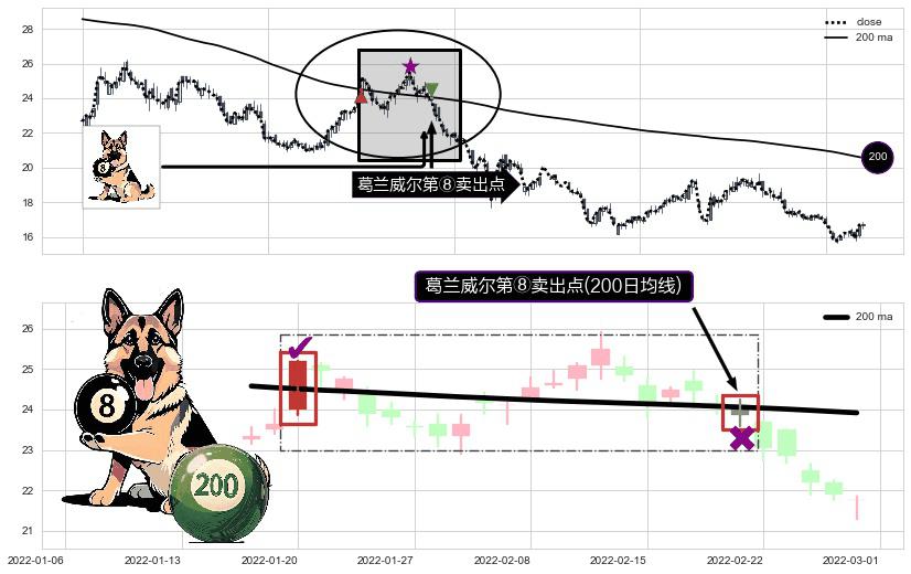 形态多维评估: ⚀ 2022-02-21-日显现 葛兰威尔均线 200日均线 第⑧卖出点 下降趋势的中继信号,后市看跌,卖出信号