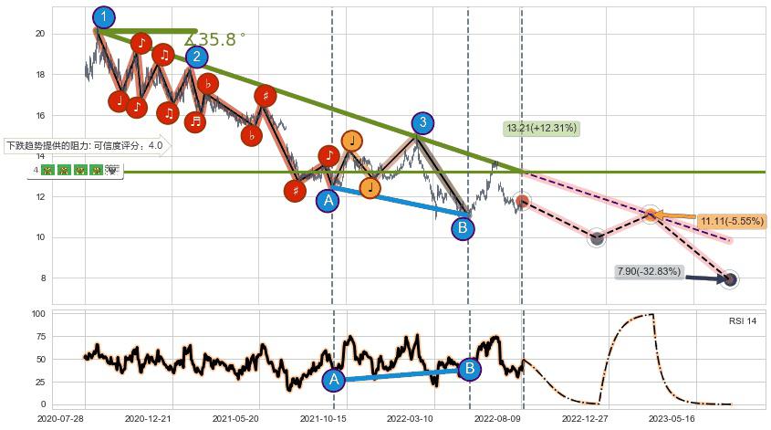♘ 阻力价格位12.22,可信任强度52.30%,距离最后交易2022-08-12形成的收盘价格11.76相差 +3.93%