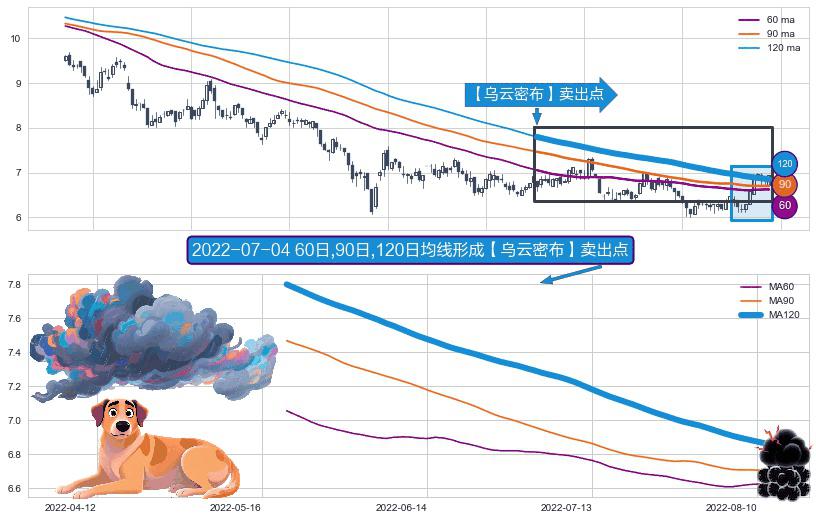 ⚀ 2022-05-19日-2022-08-12日显现 60日-90日-120日均线 【乌云密布】卖出点 看空信号,后市看跌,卖出