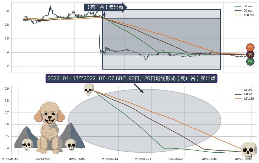 ⚀ 2022-01-14-日至2022-07-07-日显现 60日-90日-120日均线 【死亡谷】卖出点 看空信号,后市看跌,卖出