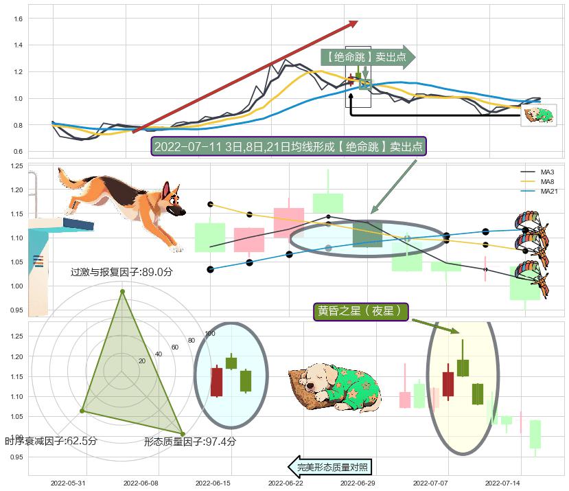 | 2 🅚:三只乌鸦 ➕ 🎢:【绝命跳】卖出点均线组合卖出点信号形成后,猜想后续向下脱离整理形态,持续破位下行 ☞ 看空信号 ⇥ 【均线】交织【🅚线】⇥ 综合量化分数: 45 | > |